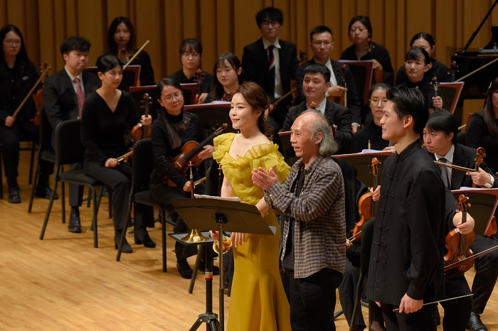 《第十二交响曲》是作曲家钟峻程为唢呐与交响乐队而作的作品,其中唢呐由当代青年唢呐演奏家刘雯雯演奏。这部作品由两个乐章组成,在本次音乐会上节选第一乐章向听众们进行展示。关于这部作品的创作起源:“广西壮族有一种乐器啵咧,与唢呐非常相似,是壮族民间音乐演奏中的主要乐器之一,作品中就是采用广西壮族民间音乐为素材,给人带来一场丰富的听觉盛宴。”整个乐章运用了高、中、低三种传统唢呐依次演奏,开篇响亮的唢呐音色与极富中国特色的打击乐音色结合,充满民族风味。唢呐的表现力极富特点,不论是对抒情旋律的演绎还是富有演奏技法的华彩段落都让人为之着迷。作曲家还将现代作曲技法与传统民间音调相结合、辉煌的交响乐队与极具民族特色的唢呐相结合,既表现了中国传统乐器的魅力,又使中西乐器完美融合,让我们从音乐中感受到广西地区少数民族的生动生活情景。