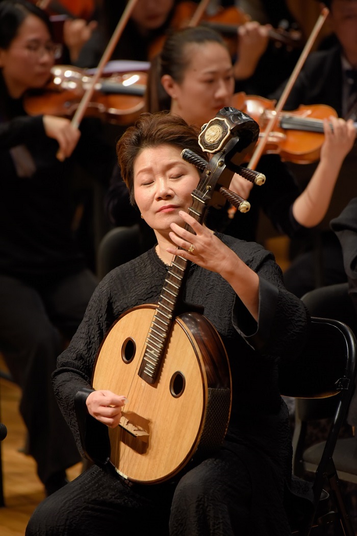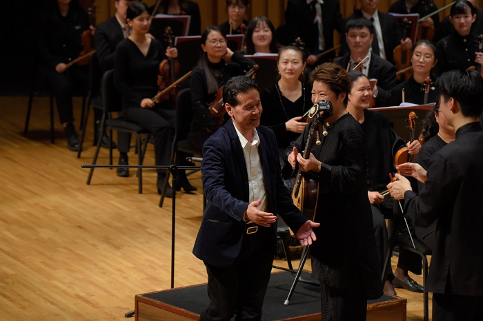 下半场音乐会的第三首曲目是作曲家周湘林为中阮与交响乐队而作的《跳乐》,中阮部分由著名演奏家吴强担任。《跳乐》的创作源自作曲家前往滇南地区采风时被当地的一种舞蹈“烟盒舞”所吸引。“舞蹈时,因每人两手各拿一个竹或木棉蝗烟盒弹跳起舞而得名,常用四弦琴(月琴)为其伴奏。”舞蹈的形式奇特、套路多变、舞步优美、节奏明快有极强的感染力。作曲家选用中阮代替四弦琴,与交响乐队交织在一起。全曲音高、结构与音色紧密联系,在音高安排上,大量使用五声性旋律的伴奏、五声性旋律纵合化,旋律声部也以大二度、小三度音程为核心展开,不同演奏技法创造出的音响效果更是瞬间调动着听众的情绪。作品的配器极具特色,作曲家以打击乐与木管组乐器加持中阮音色,起到局部的润色作用,在弦乐演奏的织体上也大量运用独特的节奏凸显出滇南地方民族特色。