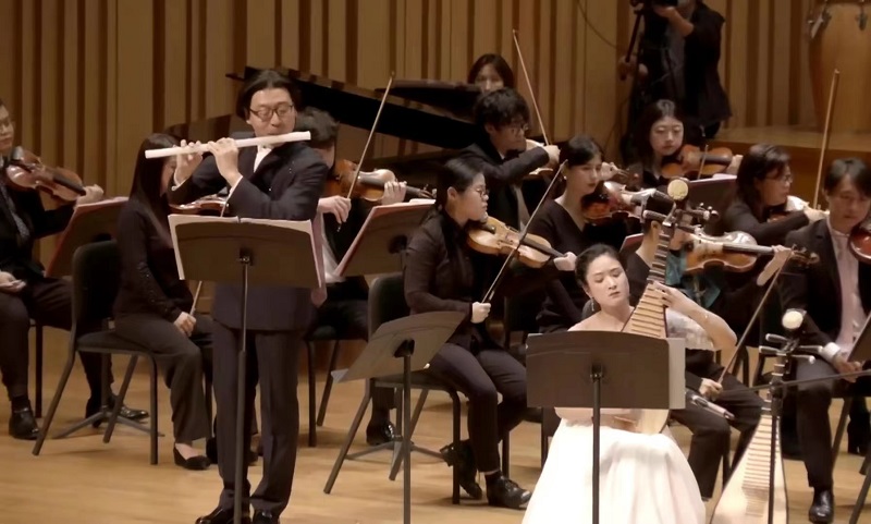 《金声玉笛·纵目》为笛、琵琶与交响乐队而作,由作曲系教授杨晓忠作曲,民乐系副教授石磊演奏骨笛、玉笛,青年琵琶演奏家付丝雨演奏琵琶。作曲家从三星堆的历史话语与现实语境提升出“声概念”,选择玉笛、骨笛、琵琶和陶埙等几种具有古蜀文化隐喻意义的标志性音色乐器作为主奏乐器,其声音形态延伸至管弦乐队多维度的音响声场并弥漫开来。它们绽放的不同音色、不同演奏技艺融于乐队中,以期表达古老、神秘、灵动、多彩的交响世界。