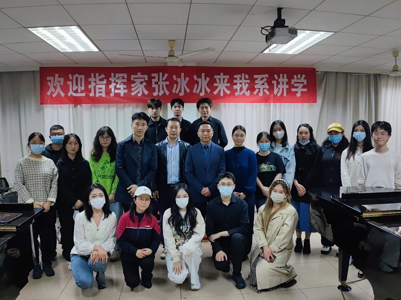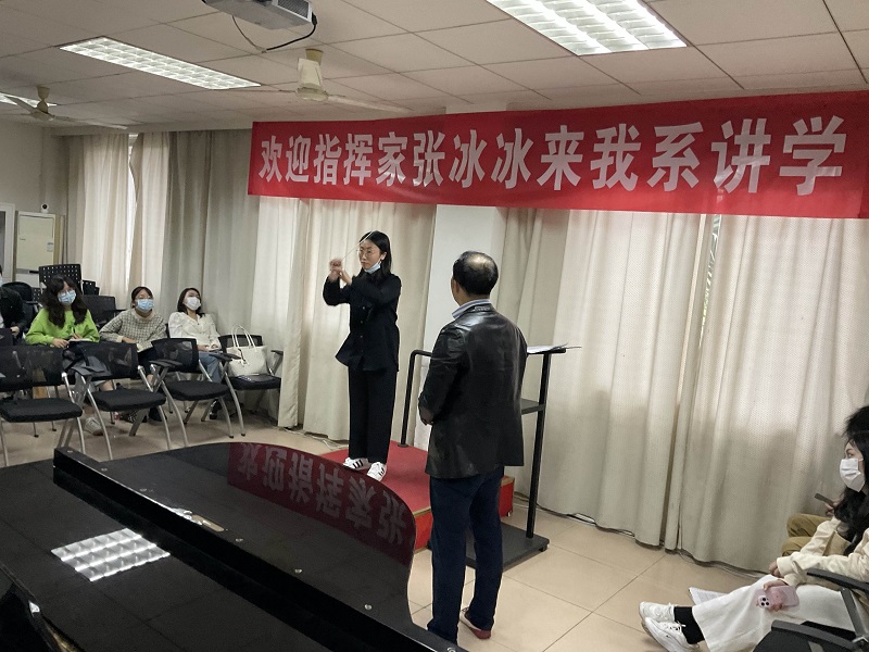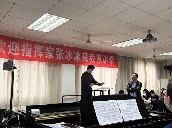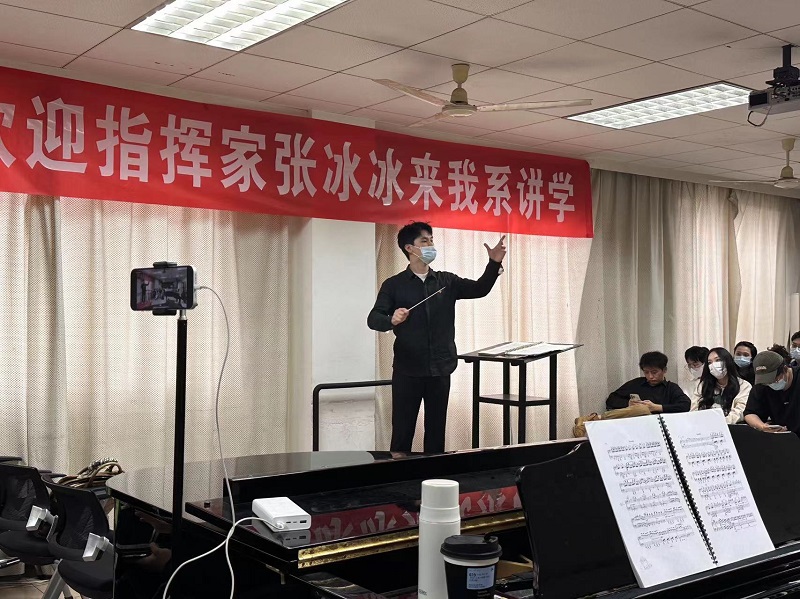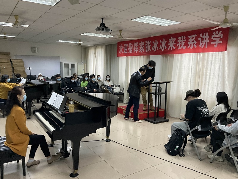 5月9日,中国广播艺术团、中国电影乐团常任指挥,国家一级指挥张冰冰来我系讲学。我系4名指挥专业学生准备曲目:贝多芬《第五交响曲》、德沃夏克《第九交响曲》、贝多芬《第八交响曲》、奥尔夫《布兰诗歌》。在张老师专业严谨、细致入微的教学中,学生从作品理解、乐团排练、指挥技法等方面得到实用又有效的提升。