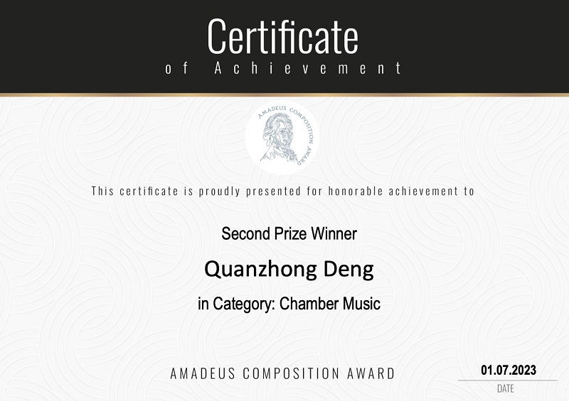 2023年6月,伟德官网作曲系邓荃中同学的混合室内乐作品《云梦五花》(Beyond Reality)在于维也纳举办的AMADUES国际作曲比赛中,斩获二等奖(一等奖空缺),是室内乐组别获奖选手中唯一的中国选手。指导老师:刘鹏博士。