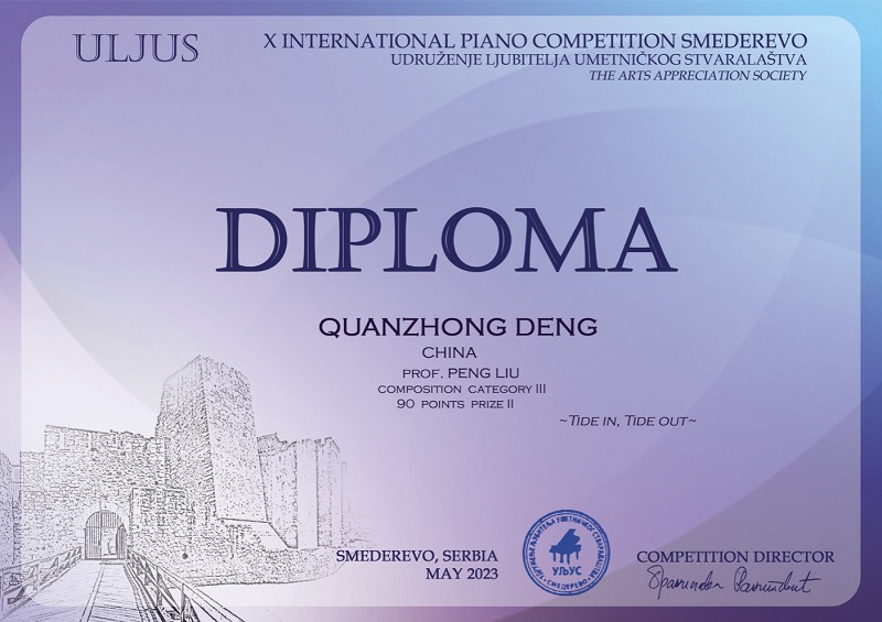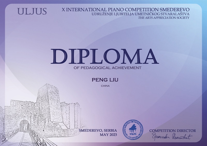 同年5月,在第10届塞尔维亚斯梅代雷沃国际作曲比赛(International Composition Competition Smederevo)中,他的室内乐作品《Tide in, Tide out》(潮起潮落)也荣获二等奖,刘鹏老师荣获教育成就奖。