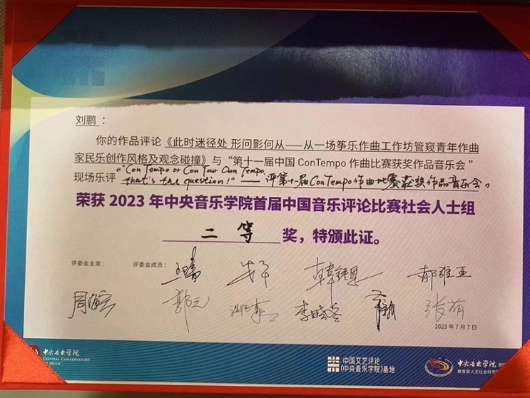 2023年7月5日至7月7日,中央音乐学院成功举办了首届中国音乐评论比赛决赛及研讨会,我系教师刘鹏博士的作品评论《此时迷径处 形问影何从——从一场筝乐作曲工作坊管窥青年作曲家民乐创作风格及观念碰撞》和“第十一届中国ConTempo作曲比赛获奖作品音乐会”现场乐评《Con Tempo or Con Your Own Tempo, That’s the question!——评第十一届中国ConTempo作曲比赛获奖作品音乐会》在激烈的比赛中脱颖而出,荣获2023年“中央音乐学院首届中国音乐评论比赛”社会人士组二等奖(一等奖空缺)。