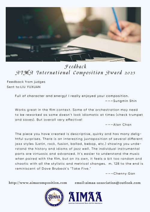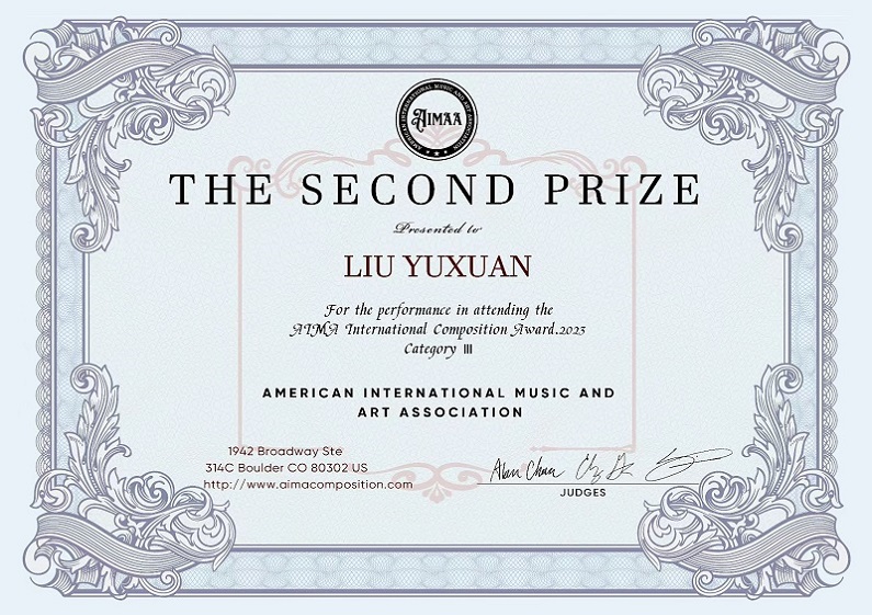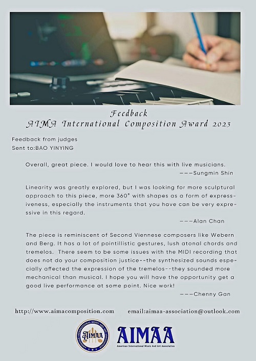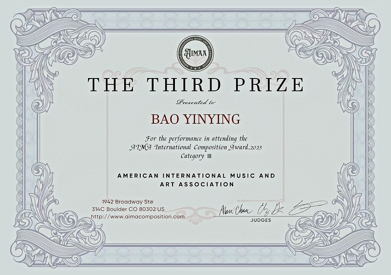 2023年9月,伟德官网作曲系学生鲍茵莺同学的室内乐作品《溯》获得美国AIMAA国际作曲比赛三等奖(指导老师:敖翔副教授),刘雨轩同学的配乐作品《La Vida De Una Piñata》也获得该项赛事二等奖(指导老师:施子伟教授),他们的作品获得了国际知名的作曲家及音乐家点评。