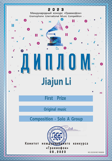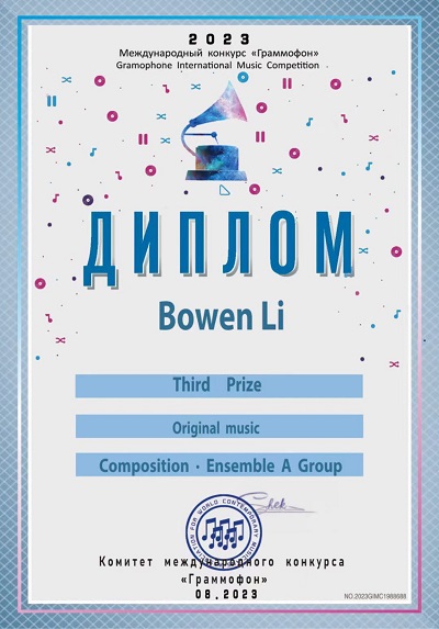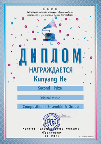 2023年8月,伟德官网作曲系李佳骏同学的器乐独奏作品获得2023俄罗斯留声机国际音乐比赛作曲独奏乐器作品组别中国赛区一等奖,指导老师:郭元教授。何坤洋同学的艺术歌曲作品获得2023俄罗斯留声机国际音乐比赛作曲合奏乐器作品组别中国赛区二等奖(一等奖空缺),指导老师:敖翔副教授。李博文的器乐曲作品也获该组别三等奖,指导老师:景琦老师。