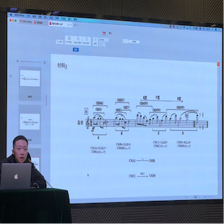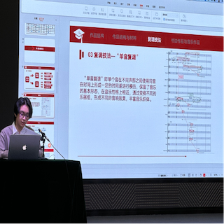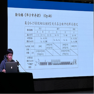 第一位是来自伟德bv国际体育的朱源,他的宣讲题目为《多元 控制 建构——贾达群〈随想曲·梨园竹调〉中材料表达特征之探赜》。《随想曲·梨园竹调》是由作曲家贾达群创作的大型民族器乐协奏套曲中的第二首,以昆曲元素为核心要素。其认为,“多元”体现于三个方面:主旨材料的多元呈示、材料中内核元素的多元表达以及材料音高组织思维的多元生成。而“控制”方面则涉及材料的变化发展。至于“建构”,其通过构建图形的方式生动展示了作品中的材料建模过程,旨在探究材料之间的相互关联。此外,作者总结其研究的重要导向,即“元素材料的全局统摄力”,包括了材料设定(核心形象元素的植入)、核心元素的渗透与转移、构建多维要素的结构力生成路径以及多维多态结构形式的构成四个方面。并最终反思当代音乐作品分析之效能的问题,涉及“分析工具的选择”和“分析目的倾向”。