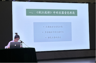 第七位上海音乐学院袁东亚的题目是《沈叶〈戏影III·秋江放棹〉声音组织与结构形态探究》。该曲汇集了中国传统、朝鲜族和西方乐器,融入了苏轼的古诗,通过独特的音响呈现了深远而广阔的意境。文章从《秋江放棹》中的乐器音色布局、音色音响形态以及整体结构与曲体特征三个部分展开论述。作者利用频谱图和频响图对大笒、伽倻琴、二泉胡等乐器及其类似音色的乐器进行比较分析,揭示了作品中乐器音色的特殊配置。文章从同质化音色融合、异质音色的同质化处理、异质化音色的对比、同质音色的异质化处理以及各段落控制下的整体音色布局等方面对其音色音响形态进行了全面解读。第三部分论文重点关注了作品的整体结构特征,即二分与三分元素的结合,通过全曲频谱图展示了每个乐章都隐藏着二分结构。