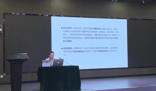第一篇宣讲的论文,是来自武汉音乐学院王卓的《山水逶迤•阴阳轮回--梁雷管弦乐作品<千山万水>“笔墨”文化研究》,文章分为三个部分:一、音级流转中的阴阳之变。作者在文章中指出:“知白守黑”“虚实相生”巧妙实现了对立音高材料的相互转换,与中国传统文化中的阴阳哲学观念高度契合。二、山水布局中的多重结构思维。作品中引入了“不齐之齐”的章法布局,这种灵活的布局形式,同时结合对西方传统曲式原则与中国民间音乐曲式特征的思考,在不同结构比例中形成多种结构元素间的不同步对位关系。三、文化“笔墨”中的意象表达。中国传统山水画具有强烈的生命力,作曲家借此以“声景”视角,为作品赋予了更深层次的内涵与表达意义。文章还从音级的生长式移转、相对性移转讲解音高材料如何相互转换,向大家展示《千山万水》中音高旋律的阴阳太极之美;从“大曲”以及“黄金分割”展示作品的曲式结构比例设计之精妙;作品将“积墨法”运用至声部中,诠释了如何用声音之笔描绘音响画卷。