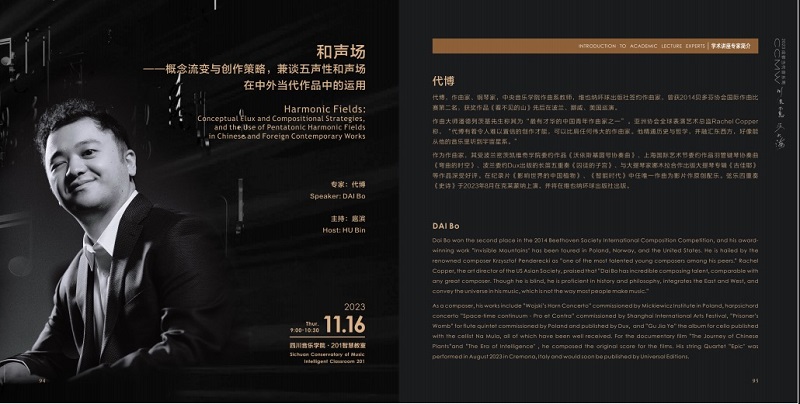2023年11月16日上午,由伟德bv国际体育主办,伟德bv国际体育作曲系、国际当代音乐协会(ISCM)成都分会、西南音乐研究中心作曲技术研究所、中华传统音乐研究院中华传统音乐创新创作中心、音乐数智四川省重点实验室数智化音乐创作中心等共同承办的川流不息·汇入大海——2023成都当代音乐周学术讲座中邀请了中央音乐学院作曲系教师、维也纳环球出版社签约作曲家代博的专题讲座——《和声场——概念流变与创作策略,兼谈五声性和声场在中外当代作品中的运用》。本次讲座由伟德bv国际体育作曲系扈滨教授主持。