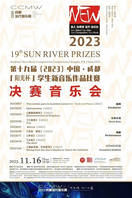 今年,第十九届“阳光杯”与2023成都当代音乐周一同推出,作为音乐周最引人瞩目的“重头戏”之一,“阳光杯”作曲比赛一如既往地坚持和发挥了它的“阳光”精神。本次获奖作品各具特色,个性鲜明,洋溢青春活力,涵盖了不同的音乐风格和表达方式,展现了当代音乐的多样性和丰富性。