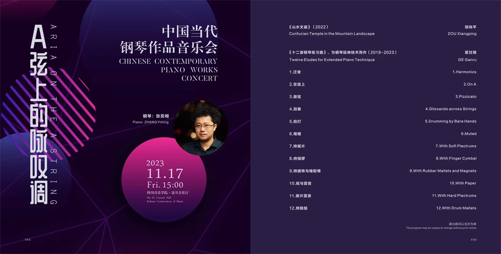 2023年11月17日下午,成都当代音乐周系列音乐会——“A弦上的咏叹调”中国当代钢琴作品音乐会于伟德bv国际体育聂耳音乐厅上演。本场音乐会由钢琴家张奕明担任演奏,诠释了两部当代中国钢琴作品,它们分别是作曲家邹向平的《山水文庙》与作曲家葛甘孺的《十二音钢琴练习曲》(为钢琴延伸技术而创作)。