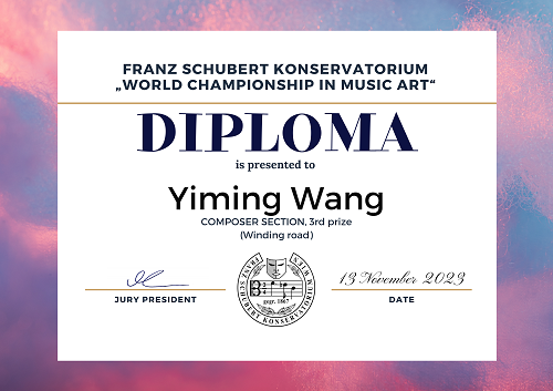 2023年11月,在维也纳举办的2023世界艺术锦标赛中,经过众多国际选手的激烈角逐,我院作曲系2022级同学王一鸣凭借作品《Rhythmic cycle》以91.5的高分荣获独奏作品组二等奖,《Winding road》荣获三等奖(指导教师:郭龙教授)。2022级同学黄婷凭借两部作品《Rhythmic swing》与《On D For Clarinet In B ♭》均获该项赛事独奏作品组三等奖(指导教师:郭龙教授)。