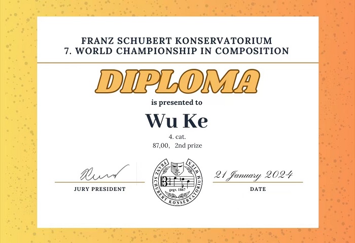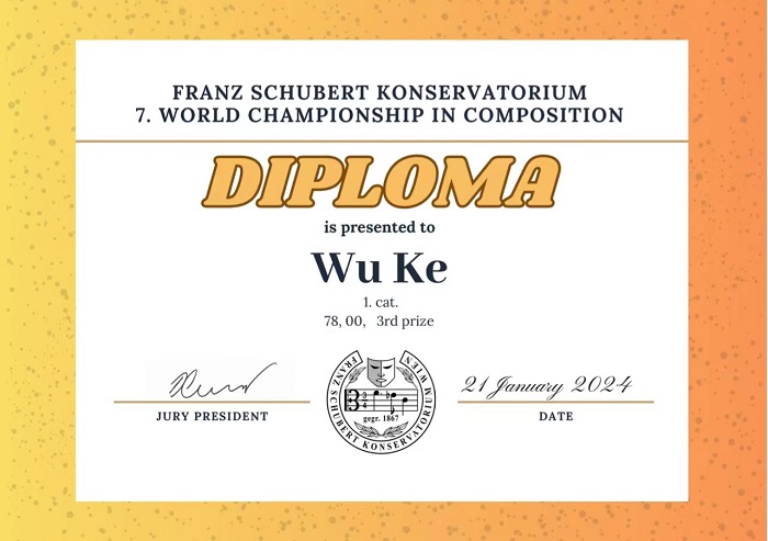 近期,在奥地利维也纳举办的第七届世界作曲锦标赛(7th WORLD CHAMPIONSHIP IN COMPOSITION)于2024年1月27日落下帷幕。此次赛事经过激烈的角逐和评委团的细致评审,伟德官网作曲系2022级研究生邬可(导师:施子伟教授)所创作的室内乐作品《梦境的奇异共振》及古典吉他作品《破晓》分别荣获室内乐组二等奖(一等奖空缺)和独奏乐器组三等奖。