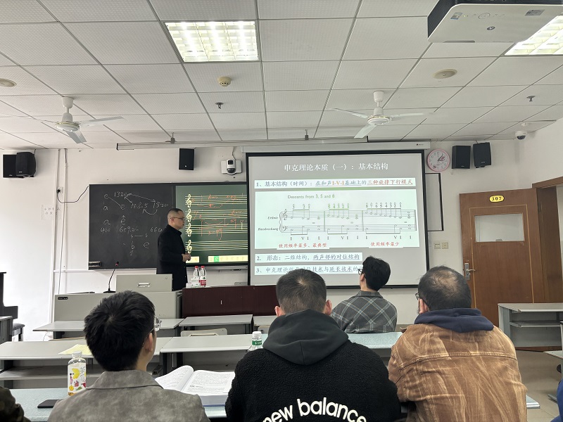 在将申克理论具体的图谱符号标记法、分析细则以及延长技术等一一做出讲解之后,杨教授随即带领参会者进行具体作品分析实践,以理论结合实践的方式将传统的申克理论分析方式给予最为生动的呈现。