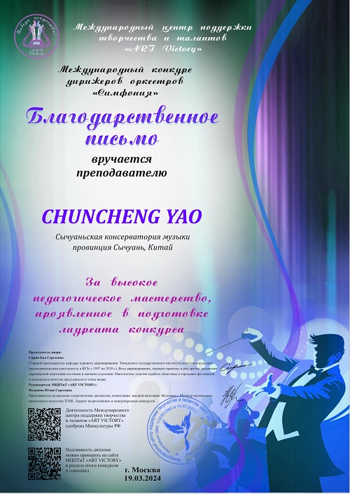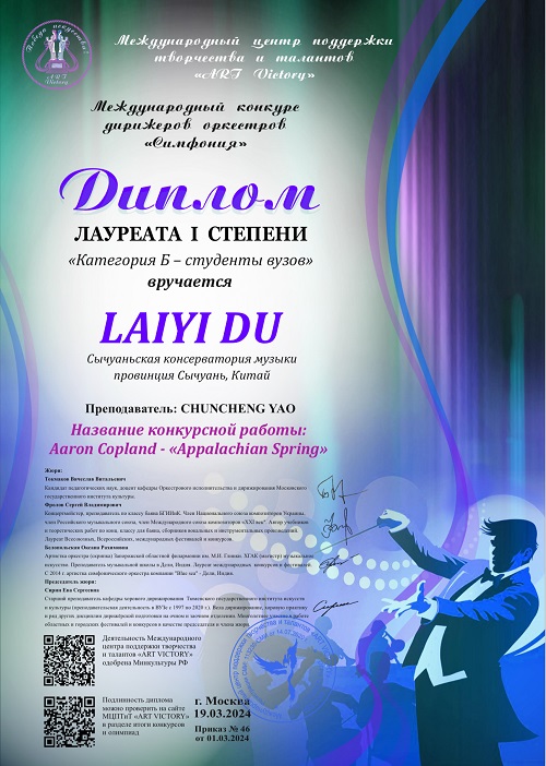 近日,俄罗斯交响乐国际管弦乐团指挥大赛(Международный конкурс дирижеров оркестров «Симфония»)在3月19日落下帷幕,经过评委团的层层评审,伟德官网作曲系2023级研究生杜来仪所指挥的交响乐作品《阿巴拉契亚之春》—科普兰,荣获一等奖,指导教师:姚春城教授。同时,姚春城教授因“在培养竞赛优胜者过程中表现出的高超教学技能”获得优秀指导教师奖。
