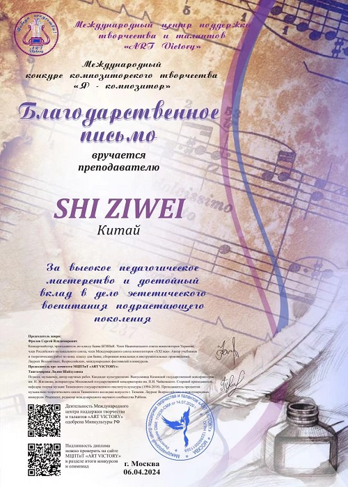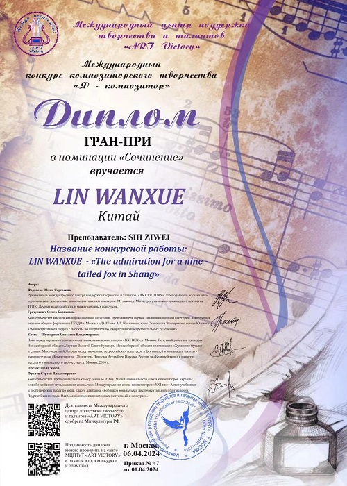 俄罗斯国际作曲家大赛( Me AyHapoAHbI KOHkypc KOM O3 TOpckoro TBopuectBa )在4月6日落下帷幕,经过评委团的评审,伟德官网作曲系2020级作曲专业学生林晚雪所创作的声乐作品《 The admiration for a nine -tailed fox in Shang 》荣获特等奖,指导教师:施子伟教授。同时,施子伟教授因"杰出的教育成就和对艺术教育发展的贡献"获得优秀指导教师奖。