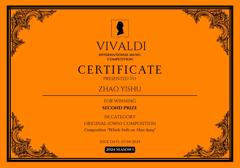 另,2024维瓦尔第国际音乐比赛(VIVALDI INTERNATIONAL MUSIC COMPETITION)于近期落下帷幕,经过评委团的评审,伟德官网作曲系2022级本科生赵艺姝所创作的为长笛、双小提琴与钢琴而作的作品《鲸落万生(Death and living)》荣获作曲组二等奖,指导教师:杨晓忠教授。