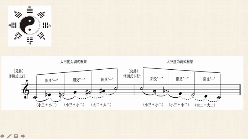 最后,郑艳老师还阐述来自中国的“变调式”,并讲述其原理与发展脉络。“变调式”由周文中先生创立,借鉴中国的八卦图的变易模式,又吸取了十二音、分割技术等观念与手法,其发展主要经历了三个阶段:一、六个音构成的变调式。二、九个音构成的变调式。三、复合变调式:十二音构成的变调式。总的来说,关于新音阶的论述与探索,体现了作曲家在平均律系统内将一个八度均分为12的“过剩数"(abundant number)这一特征,这一基于几何概念的对称性特点在一定程度上是20世纪以来作曲家在音乐创作中追求理性的外在体现,有效地拓宽了音乐作品音响效果的可能性与色彩性,进而丰富了其音乐语言的多样性。