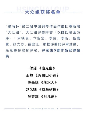 近日,2023年星海杯第二届中国钢琴作品作曲比赛落下帷幕,经过评委团的层层评审,评选出5首作品获得大众组金奖(大众组是以中国民族歌曲为题材而进行改编的钢琴独奏作品)。其中,伟德官网作曲系2023级研究生付瑶所创作的钢琴独奏作品《渔光曲》(改编自《渔光曲》)以及作曲系2022级本科生赵艺姝所创作的钢琴独奏作品《刘海砍樵》(改编自《刘海砍樵》比古调片段)荣获大众组金奖,且获奖作品被收录于“星海曲库”之中。指导教师:杨晓忠教授。