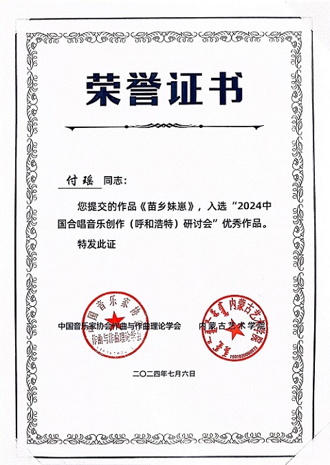 2024中国合唱音乐创作(呼和浩特)研讨会组委会自发布合唱作品和论文征集通知以来,共收到来自全国各地的合唱新作品202部、学术论文35篇。经组委会研究和协商,合唱作品分为初评和终评两个环节。初评评委由陈丹布、段泽兴和韩星宇三位作曲家担任,监审由师占成(内蒙古艺术学院音乐学院院长)担任;最终遴选出53部合唱作品入围终评。终评评委由叶小纲(评委会主席)、徐孟东、郝维亚、周湘林、唐建平、韩兰魁和叶尔达共七位作曲家组成,最终评选出15部优秀中国合唱作品。经组委会最终遴选出15部优秀中国合唱作品,我系2023届研究生付瑶作品《苗乡妹崽》入选并作为优秀作品由中央民族大学音乐学院青年合唱团进行展演。