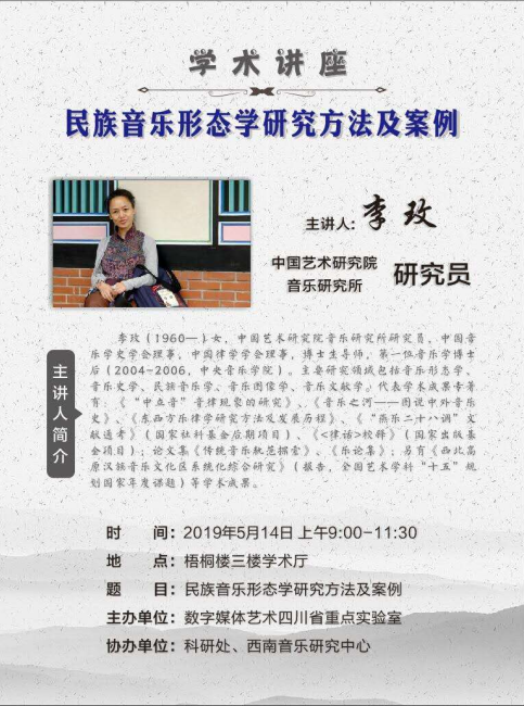 5月14日上午,中国艺术研究院音乐研究所李玫研究员应邀到伟德官网举办《民族音乐形态学方法及案例》讲座。讲座由宣传部长、科研处长、实验室办公室主任雍敦全教授主持。作为实验室春季学术交流活动的一部分,李玫研究员的讲座以如何分析探究“音乐类非物质文化遗产”的宏观议题入手,通过对“燕乐二十八调”理论的梳理分析、中立音现象的律学本质之探究等相关研究成果的介绍,为川音师生带来了一次知识的高强度、高密度之体验。电子音乐系、音乐学系、艺术学理论系、艺术教育系相关专业师生参加了此次活动。