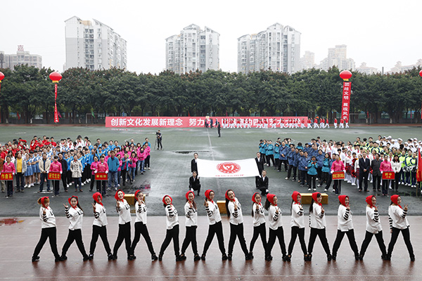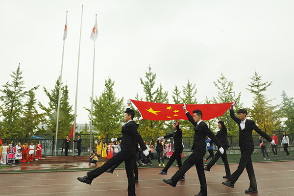 身着五十六个民族服装的学子们高举鲜艳的五星红旗,迈着欢快的步伐经过主席台,三位师生领唱《歌唱祖国》。在庄严的国歌声中,五星红旗冉冉升起。运动场气氛庄严激昂。