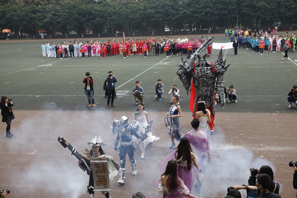 伴随着激昂的《运动员进行曲》,国旗队、会旗队、党政工团、基础部、研究生处、行进乐团以及各院系共33个方队迈着矫健的步伐,意气风发地依次入场。各代表队以充满创意和乐趣的表演形式,展现了各自学科特色和文化特征。精彩纷呈的入场式隆重而欢快,充分展现了川音人健康快乐、斗志昂扬的精神面貌,赢得了全场观众阵阵热烈喝彩。