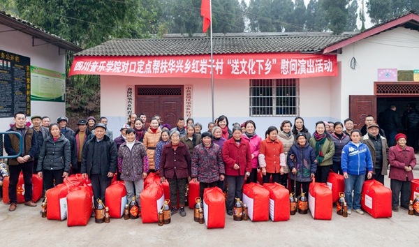 在红岩子村,党委副书记文云英、侯钫深入因残、因学、因病致贫的唐先前等5户困难户家中开展慰问,与他们嘘寒问暖,向他们宣传党的扶贫政策,并鼓励他们战胜疾病,增强脱贫的信心。当天下午,慰问组在该村活动室门前小院坝为当地老百姓进行了“送文化下乡”慰问演出,表演了声乐、小提琴、手风琴、竹笛等节目。在欢乐祥和的气氛中,通过“你问我答”、全场互动等轻松愉快的方式,为村民们普及了音乐、乐器知识。全场欢声笑语、掌声不断,当地老百姓也自发为大家表演了扇子舞。演出结束后,校领导为全村49户建卡贫困户送上了棉被、食用油等慰问品。