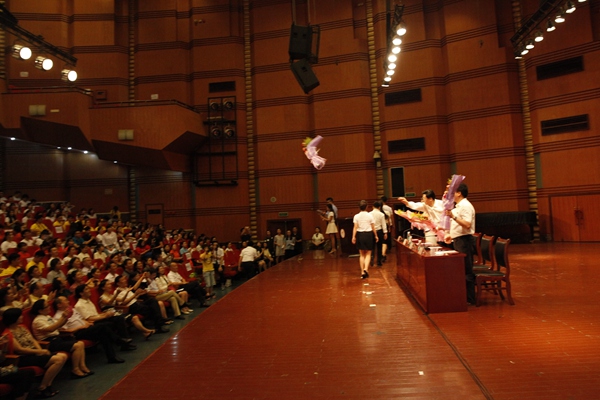 毕业生代表向校领导献花。在热烈的掌声中,校领导将花束抛向硕士生导师,硕士生导师将花束赠予学生,一束束鲜花在礼堂里传递,既是学子们对亦师亦友的人生导师们的感恩和感激,也是母校对学业有成的学子们的祝贺与祝福。