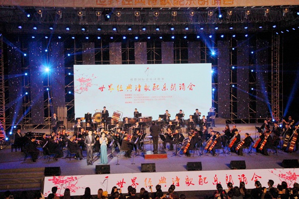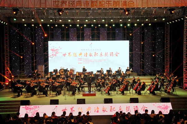 配乐朗诵会以我院院长林戈尔教授专门为此次盛会谱写的大型交响乐《音乐之都 诗歌之城》为开场序曲,展示了成都作为“音乐之都”的恢宏和“诗歌之城”的婉转。著名朗诵家丁建华、郭凯敏、董凡等分别朗诵了《致橡树》《祖国啊我亲爱的祖国》《海燕》《再别康桥》和莎士比亚十四行诗等脍炙人口的经典诗歌。伟德官网优秀教师也登台朗诵、放歌,为观众展示诗歌与音乐的魅力。艺术学理论系主任王世才朗诵了叶芝的《当你老了》;歌剧歌唱系副主任唐竹雅演唱普契尼歌剧《图兰朵》中的插曲《今夜无人入眠》;声乐二系教师刘玲演唱普契尼歌剧《托斯卡》中的《为艺术为爱情》,他们的演出饱含深情、韵味十足,以形象鲜明的声音色彩和纯熟的艺术技巧让现场观众沉浸在诗歌音乐艺术的意境中。在配合一首首世界经典诗歌朗诵时,川音交响乐团和成都乐团根据诗歌的特点,选取了几十首符合诗词意境的配乐演奏,在著名指挥家、伟德官网交响乐团首席指挥朱其元先生的执棒下,配乐或轻盈婉转,或豪情万丈,让人感受到音乐与诗歌的荡气回肠。