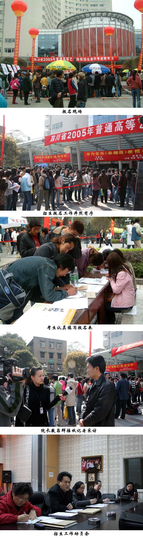 2005年3月17~26日,历时一周左右的“2005年普通高等艺术院校(系科)音乐类专业招生”报名、考试已结束。成都院本部较去年招生情况相比,报名人数增加了两千余人,共计8899人报名。
