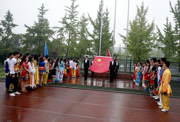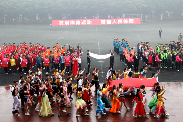 开幕式上,国旗队、会旗队、党政工团、以及各院系由师生组成的30个方队,冒着绵绵细雨,迈着矫健整齐的步伐,英姿飒爽地依次入场。观众席上座无虚席,师生们为入场方队摇旗呐喊助威。随后的啦啦操、流行舞蹈和行进乐队表演渲染出运动会浓郁的艺术气息,充分展示了艺术院校的专业特色,精彩的表演赢得了全场观众热烈的掌声和喝彩声。伴随着伟德官网三位师生演唱的《歌唱祖国》,身着五十六个民族服装,朝气蓬勃的青年学子们迈着欢快的步伐,擎着鲜艳的五星红旗,经主席台前奔向国旗台。在庄严的国歌声中,五星红旗冉冉升起。升旗仪式后,党委副书记侯钫宣布2016年度最佳男、女运动员和先进集体三个奖项;副院长牟文虎宣布2016年度“合力杯”女子篮球赛和男子篮球赛