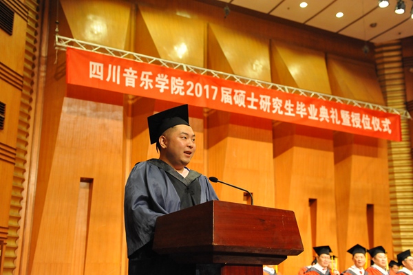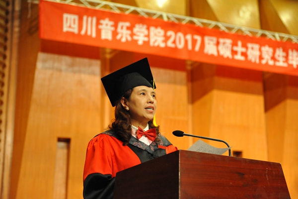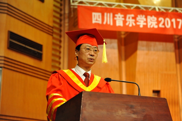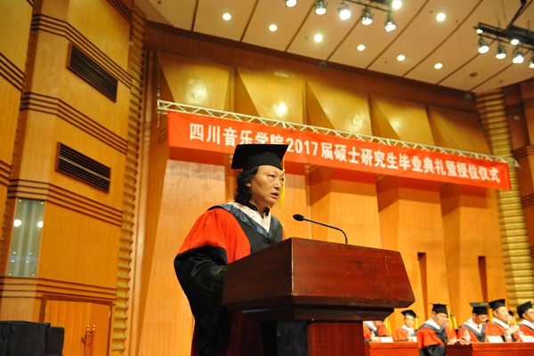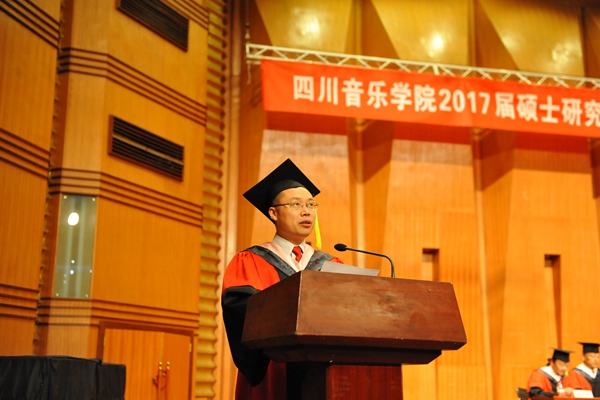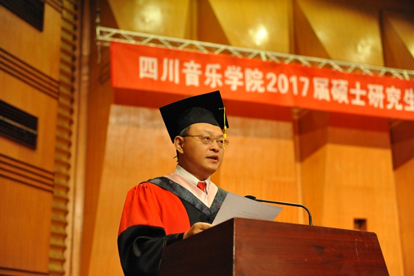 党委书记林戈尔教授首先向圆满完成研究生学业的210名同学表示最热烈的祝贺!向辛勤耕耘的导师们、默默奉献的教职工们以及无私操劳的家长们致以诚挚的谢意!他说,三年的研究生学习使同学们具备了一定的艺术审美、鉴赏、表达与研究能力,为自己、为家长、为学校递交了一份完整的答卷。作为合格的“川音人”,大家虽不能发明出造福人类、改变世界的科技成果,但是同学们创造的软实力成果却能带给人们愉悦的情怀、高雅的生活,能让人们憧憬美、感受美、拥有美、支配美,鼓舞人们奋发向上。同学们是艺术领域的高级人才,要在创作、表演等软实力领域更好的展示自己、服务社会,把最美的音符传遍世界。同学们要明白研究生文凭不止是工作、待遇、事业、前途的敲门砖,作为一名研究生更要有一份历史责任与担当,要建立起某一行业的理论,促进其发展,探寻某一领域的规律,使其上新台阶。希望同学们在今后的学习生活中,要有继续从事研究工作的毅力,要有服务社会的能力,要有教书育人的学术资历,也要有甘做一个平凡人的定力。要勇往直前,朝着自己的奋斗目标义无反顾地走下去。