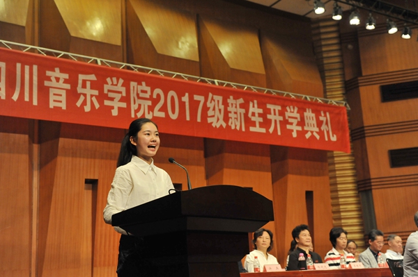 新生代表、声乐系徐颖巧首先向老师们致以教师节的祝福和感恩。她说,来自各地的我们为了心中的艺术梦想相聚在川音,学校的领导、老师、学长学姐们让我们感受到来自川音大家庭的温暖。我们将尽快适应新的大学生活,严守校纪校规,勤奋刻苦学习,讲究文明礼貌,注重团结协作,做一个好学、敬业、德高、技强的川音人。