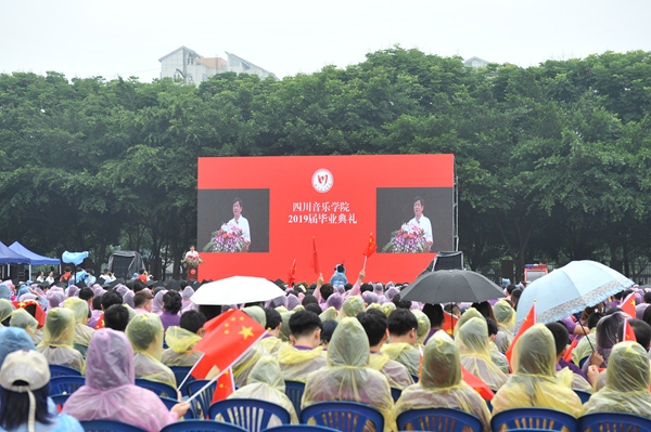 典礼伊始播放了学校将传统民乐和现代流行乐结合起来重新编曲的《我们都是追梦人》视频,以《歌唱祖国》为主题,同时将《东方红》主题巧妙融入其中,由师生们倾情演绎,展现在川音求学的经历和成长,铭记母校恩情、感怀师生情谊。此次毕业典礼首次采用交响乐团现场配乐、学生合唱团现场演唱的方式进行,用优美而震撼的音乐衬托着2019届毕业生们青春与梦想的奋斗故事。而今年又恰逢建国70周年、建校80周年,在校领导、师生及家长代表肃立齐唱国歌的庄严时刻,整个会场更是充满了庄重而热烈的气氛,萦绕着毕业学子们爱国爱校的深厚情怀。