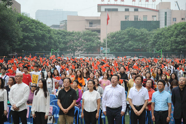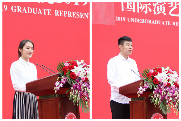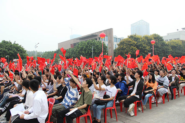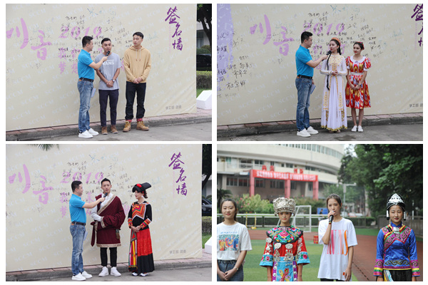 现场气氛热烈而庄重。在“一时川音人 一世川音情”环节中,校领导和教师代表为2019级新生代表佩戴校徽。校徽承载着川音“尚美、创新”的校训,寄托着川音“明德、博学、尚艺”的精神,彰显着自此成为“川音人”的使命与荣光。在“川音学子说 我爱我的国”环节中,有来自全国各地的维吾尔族、藏族、彝族等少数民族学生,以及来自中国香港、台湾地区的学子为新中国70岁生日献上祝福。现场师生、家长挥舞着国旗,欢呼声、掌声不断。