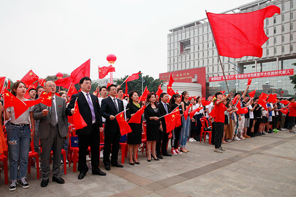 今年恰逢新中国成立70周年、建校80周年,快闪环节《歌唱祖国》将开学典礼推向高潮。旗手们高举“我们都是追梦人”的旗帜,从会场四面八方汇聚到舞台中央。现场师生、家长全体起立合唱《歌唱祖国》,以青春和热血为成长奠基,唱响昂扬向上的祖国赞歌。每个人都挥舞着手中的五星红旗,五星红旗迎风飘扬,翻涌成一片热烈的红色海洋。情如海,歌如潮,浓浓的爱国情在每个人心中激荡。