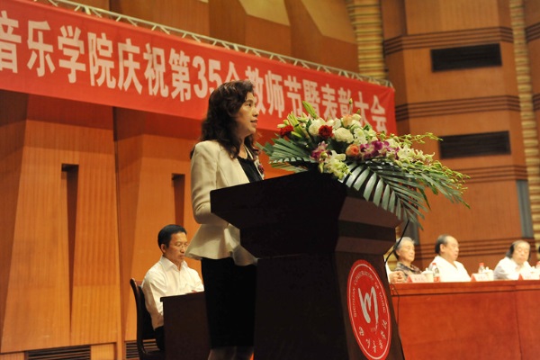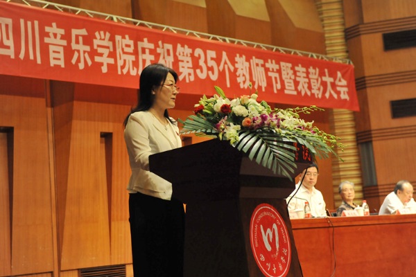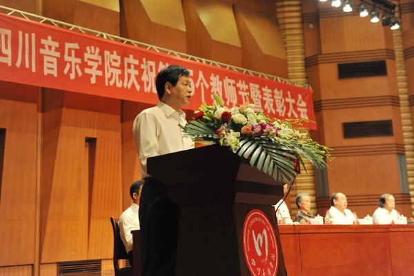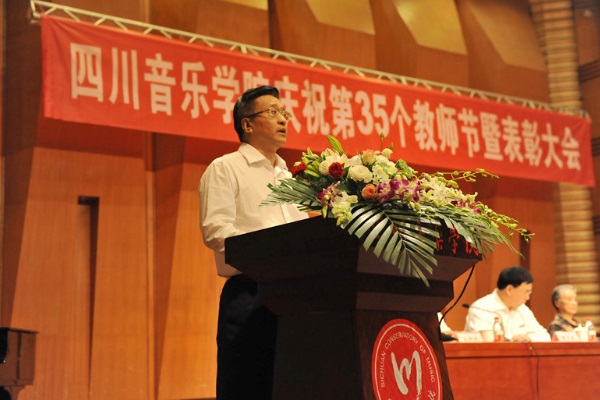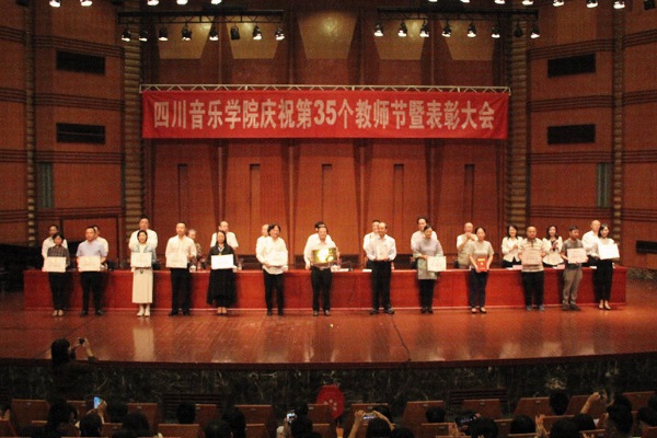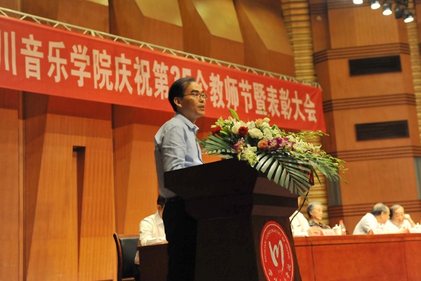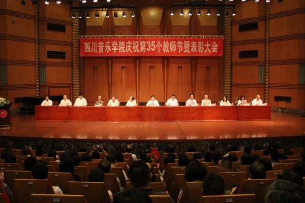 为庆祝第35个教师节,表彰默默耕耘在教学、科研、管理、服务和艺术实践一线的先进个人和集体,激励广大教职工继续改革创新、干事创业、砥砺前行,9月10日,学校在锦江校区音乐厅隆重举行庆祝第35个教师节暨表彰大会。学校党委书记洪流,院长周思源,党委副书记侯钫,党委副书记、纪委书记魏文彪,副院长文云英、孙洪斌、牟文虎、文锋,以及学校副科级以上干部、教研室主任、教职工代表、离退休老领导和老有所为先进个人代表、学生代表、受表彰的先进代表等欢聚一堂,共同庆贺教师节这个美好的节日。大会由副院长孙洪斌主持。