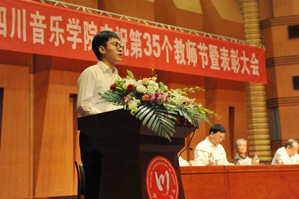 2017级手风琴电子键盘系的李浩男同学代表川音全体同学向所有默默奉献的教职工老师们表达最诚挚的节日祝福。他说,同学们会把强学力行的精神铭记于心,喻理求真的行动实践于身,努力学好专业知识,提高综合素质,回报母校,回报国家,实现中华民族的伟大复兴。
