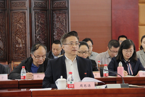 党委书记周思源就学校开展“不忘初心、牢记使命”主题教育情况作汇报。他首先从学校历史沿革、办学规模、学科建设、人才队伍建设、党建思想政治工作、校地合作等方面介绍了学校的基本情况,并从思想认识突出“三个转变”,力求用好主题教育这把“金钥匙”;组织推动突出“三位一体”,着力打造工作落实“强引擎”;创新载体突出“三个结合”,力求主题教育“花满枝”三大方面详细介绍学校推动主题教育走心走深走实的具体做法和亮点。