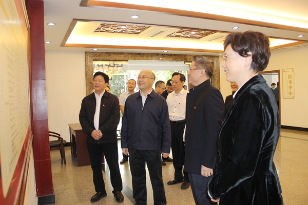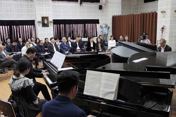 王正谱部长一行首先参观了党员活动室、院务中心,了解学校深化“不忘初心、牢记使命”主题教育,提高效能、转变作风,以服务师生为本而建成的一站式服务办事大厅。并观摩了歌剧合唱系师生排练歌剧《方志敏》片段和钢琴系教师用四台钢琴联合演奏《黄河颂》。王正谱部长与师生亲切交流,详细了解学科建设、教学成果及推进“课程思政”等方面情况。