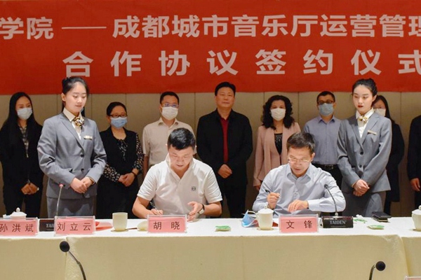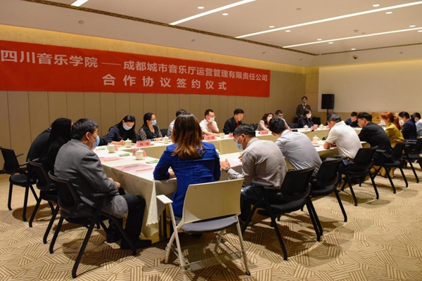 会上,文锋副院长代表学校与公司签署和合作协议,并向公司颁授了伟德bv国际体育国际文化交流基地、教学科研成果转化基地、拔尖人才培养基地、毕业生实习基地、创新创业教育基地的牌子。会后学校和公司负责同志一道参观了成都城市音乐厅。