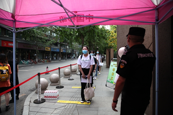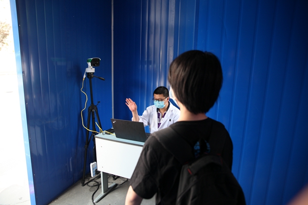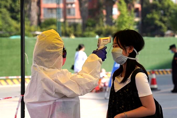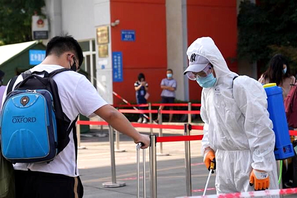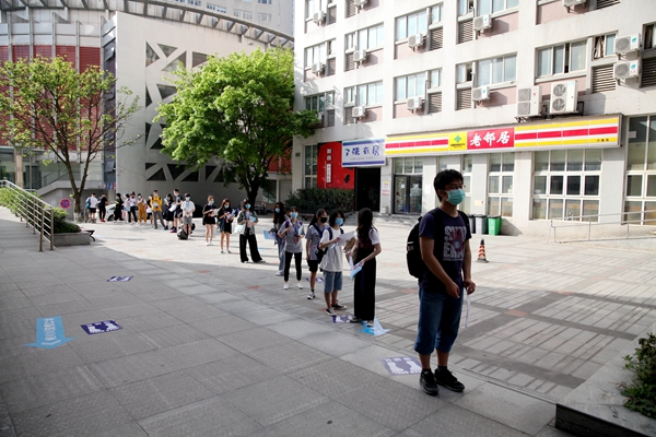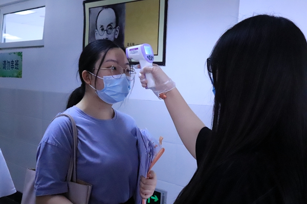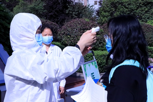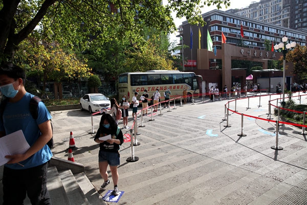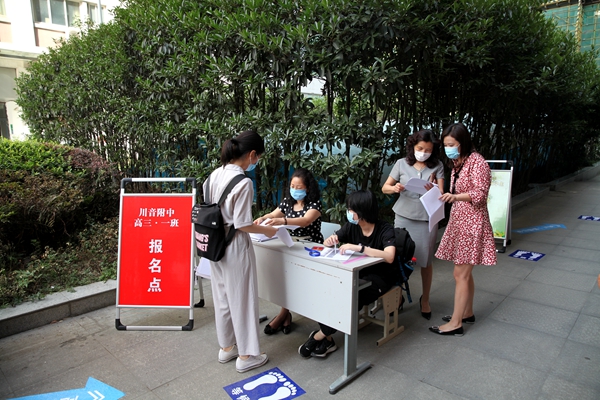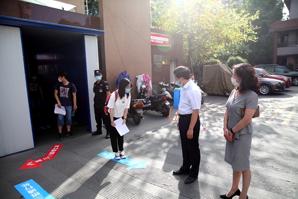 同学们按时在校门口排好队,一切按照进校流程,扫描健康码,测量体温,依次排队入校,再有序地分流到各班主任处报到。