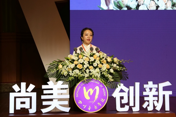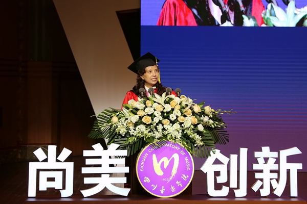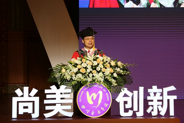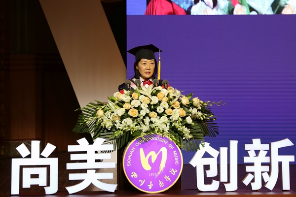 教师代表、音乐学系副主任格桑梅朵为即将远行的2020届毕业生送上老师们的希望与嘱托:希望同学要有一颗感恩的心,感恩父母在我们背后的默默耕耘和努力坚守;感恩学校,做有家国情怀的川音人;感恩老师们的传道受业、无私付出、默默奉献。要坚持脚踏实地、勤奋努力,既要有远大的奋斗目标和人生追求,也要有脚踏实地的务实精神,要牢记自己的使命和责任,不要放弃自己的理想和信念,用高尚的品德服务社会、服务人民,用求真的态度做踏实的功夫,坚守自己的追求才能抵达自己的初衷。