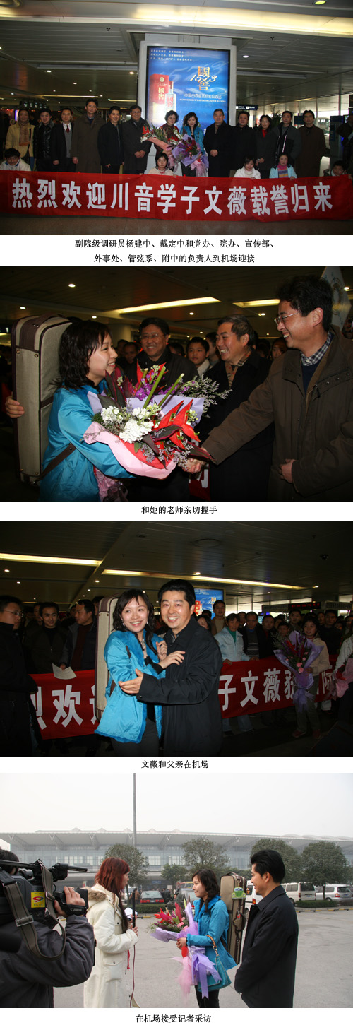 12月3日,来自伟德bv国际体育的文薇在芬兰首都赫尔辛基举行的第九届西贝柳斯国际小提琴比赛中一路过关斩将,夺得本次大赛的第三名。12月19日下午,文薇载誉归来,我院副院级调研员杨建中、戴定中及党办、院办、宣传部、外事处、管弦系、附中等部门负责人到机场迎接。