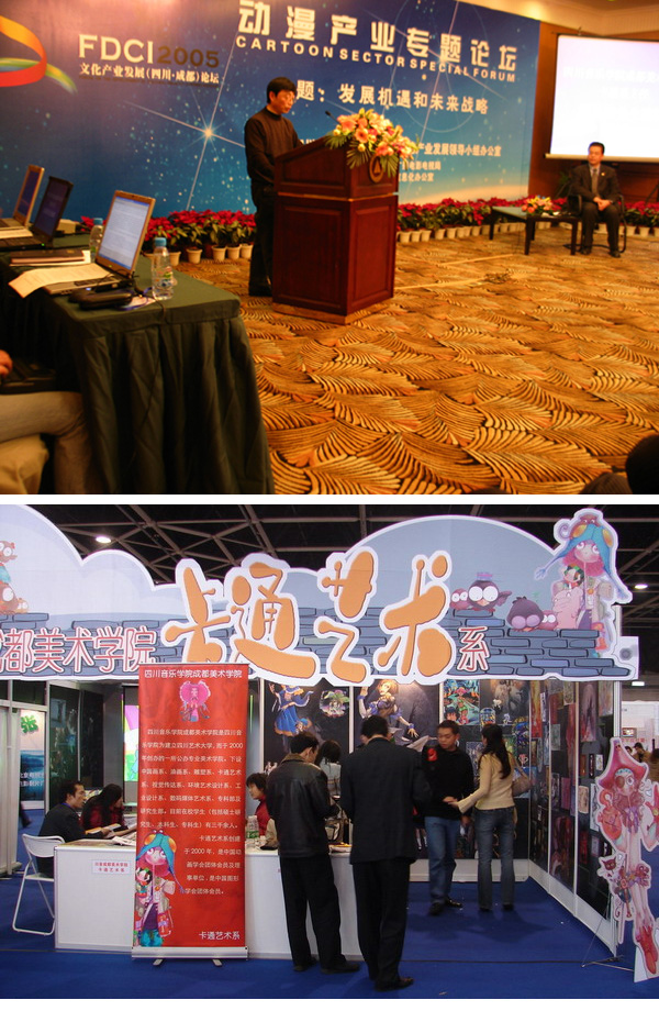 我院美术学院卡通艺术系师生和我院绵阳艺术学院美术系应邀参加了高校专区即国家原创动漫作品展专区的展览。我院美术学院卡通艺术系系主任陈昌柱被(第八届)四川电视节“金熊猫”奖国际动画数字艺术评选组委会聘为评委,参加了获奖作品的初审与终评。四川的游戏动漫企业和高校参加本次大赛作品共有20余件,其中3件作品榜上有名(一是斯普电脑公司的《三毛》、其余两件作品为我系师生所作),我院卡通艺术系青年教师高中立等人创作的二维动画短片《小溪》获专业组2D作品评选提名奖;2003级研究生聂耕宇等人创作的动画短片《反斗小玩偶》获学组作品评选提名奖。