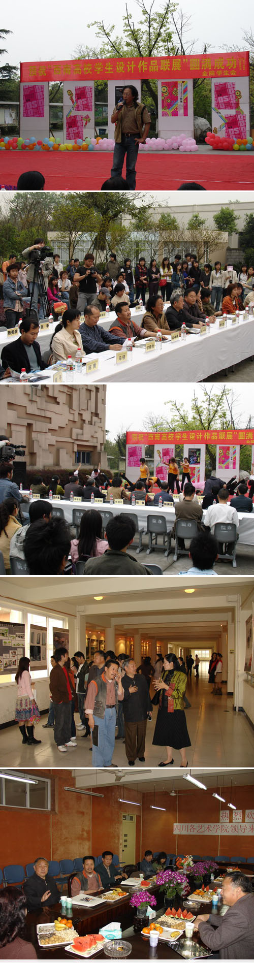 开幕式结束后,各院校领导及师生参与到学术交流中。大家分别参观了各院系的学生环境艺术、工业设计、平面设计、动画影视、数码媒体影视作品共计250余件。这些作品集中体现了西南地区艺术高校的综合实力及整体设计水平,各校学生代表也还作了精彩的讲解。我院数码媒体艺术系的影视小品以其独特的视觉、巧妙的构思、幽默夸张的拍摄方式在此次联展中格外耀眼,受到了几所高校领导、老师和学生的好评。