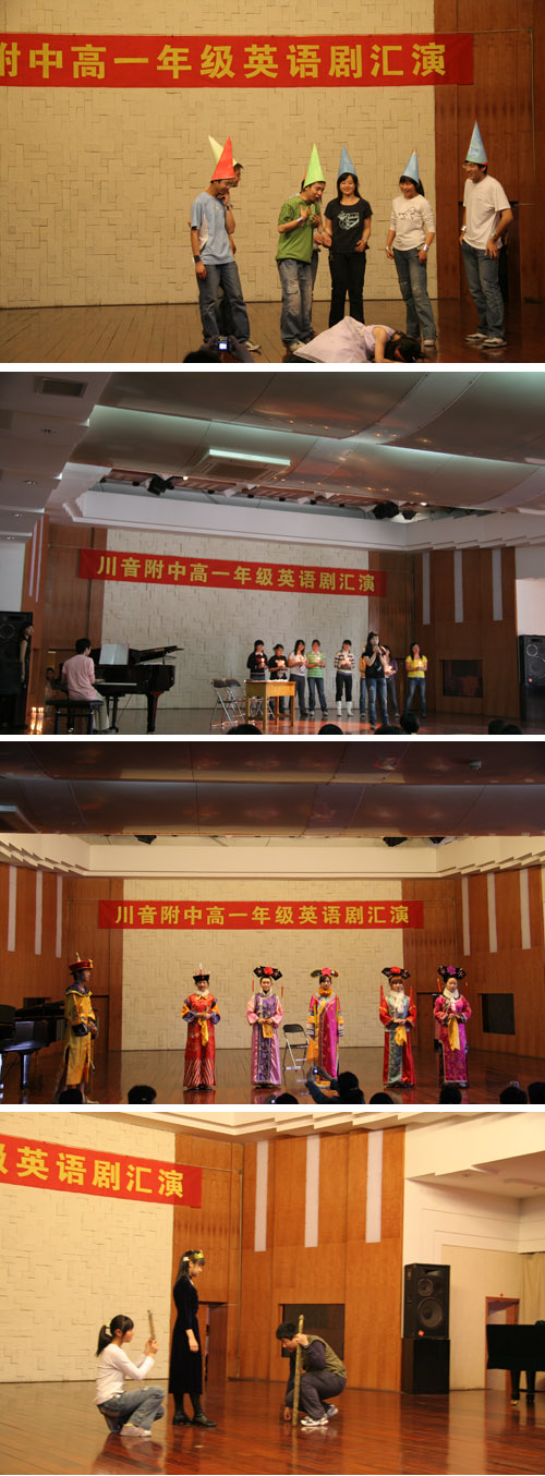 2006年4月19日下午,我院附中高一年级英语剧汇演在小音乐厅举行。此次汇演在老师的指导下由附中高一学生自编、自导、自演,同学们精彩的演出获得观众们的阵阵掌声。通过此次演出,同学们的英语写作和口头表达能力都得到了很大的提高,舞台表演能力也得到了锻炼。