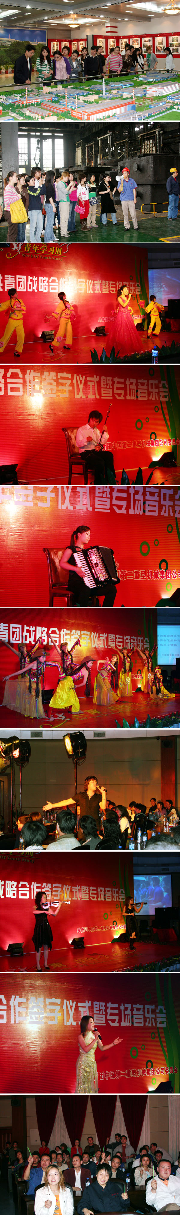 师生们一行参观了公司的展示厅、生产线,了解了中国第二重型机械集团公司的发展历程和企业文化,目睹了铸件、锻造、传动件等生产流程。通过深入企业参观学习、与企业青年座谈,师生对国家能有这样的国有现代化企业感到自豪,为企业人团结奋进、艰苦奋斗的精神所感动。我院团委书记李天昊代表我院团委同中国第二重型机械集团公司团委签订了“校企共青团战略合作协议”,并组织师生为集团公司奉献了一台精彩的文艺演出。晚会上,参演师生挥洒豪迈、释放激情,充分展示了川音师生的青春风采,高水平的演出,把晚会推向了一个又一个高潮。