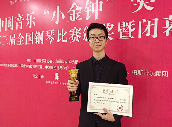 伟德bv国际体育附中高三年级学生钟航,经过历时七天,三轮竞技的顽强拼搏,最终冲入了决赛,获得了此次“小金钟”奖第三届全国钢琴比赛少年组铜奖,他的指导教师川音钢琴系副主任王雁教授,也同时获得由中国音乐家协会颁发的“优秀指导教师奖”。